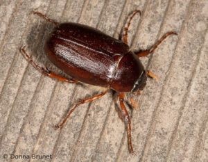 Adult — Many species of May beetles (also known as June beetles) occur in any given area. They are shiny, robust insects, reddish-brown to black in color. Oblong in shape, they reach a length of 20 to 25 mm.